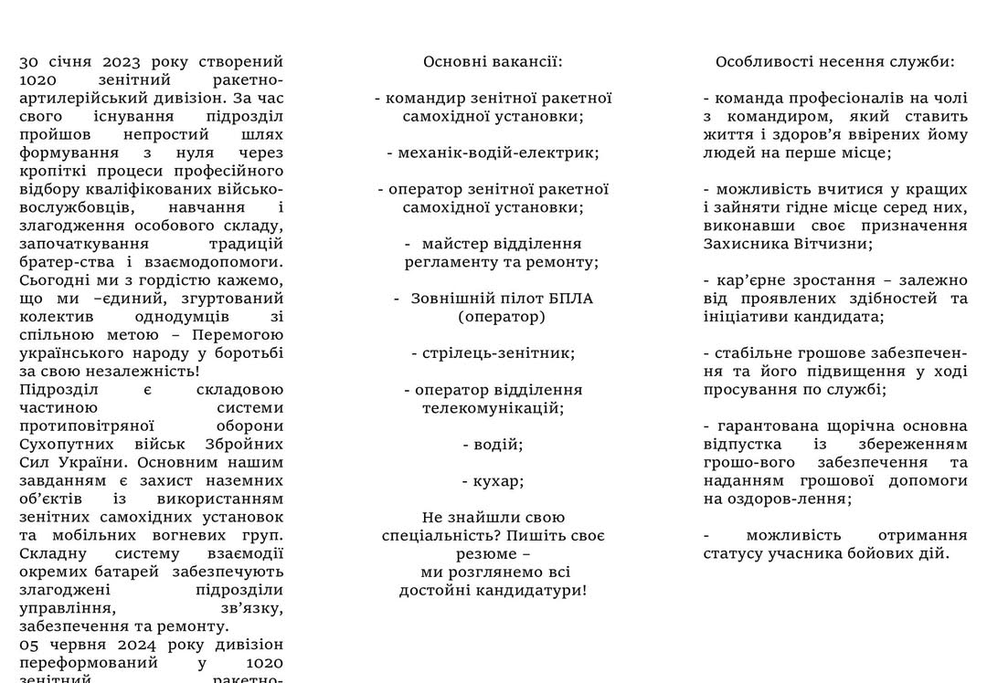 Проводиться набір військовозобов'язаних для подальшого навчання та проходження служби у підрозділах, що здійснюють бойове застосування дронів проти БПЛА літакового типу.